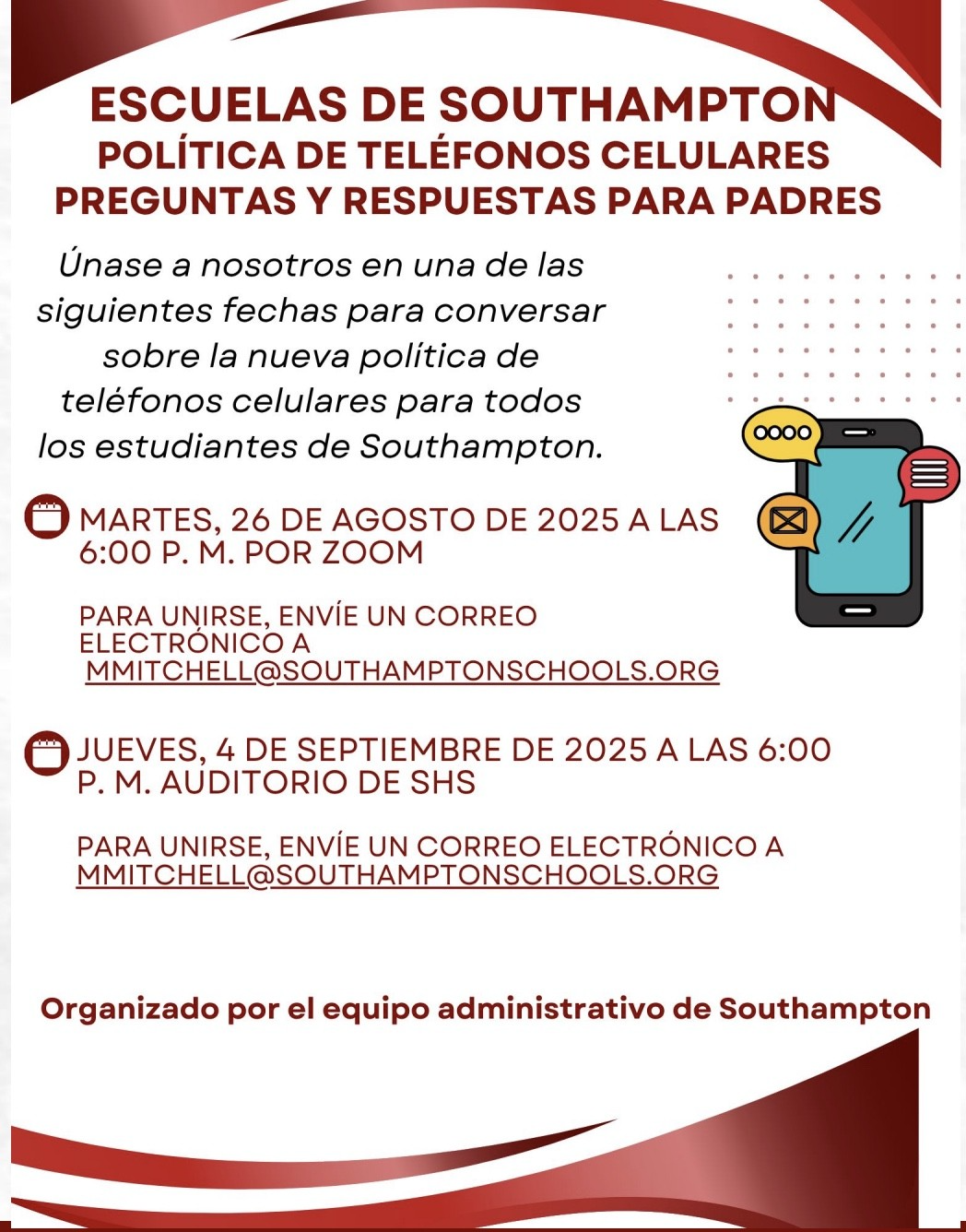 As you may know, Governor Kathy Hochul has initiated a "distraction-free schools" policy in New York State, which includes a "bell-to-bell" ban on smartphone use in K-12 schools. You can learn more about Southampton Elementary School's Cell Phone Protocol by clicking here. We are hosting two Cell Phone Q&A sessions. Please see the attached flyer for details.